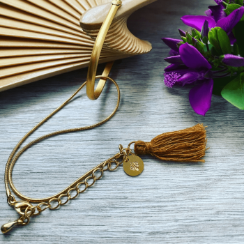 est accessoirisé d'un bracelet amovible, à pompon camel.