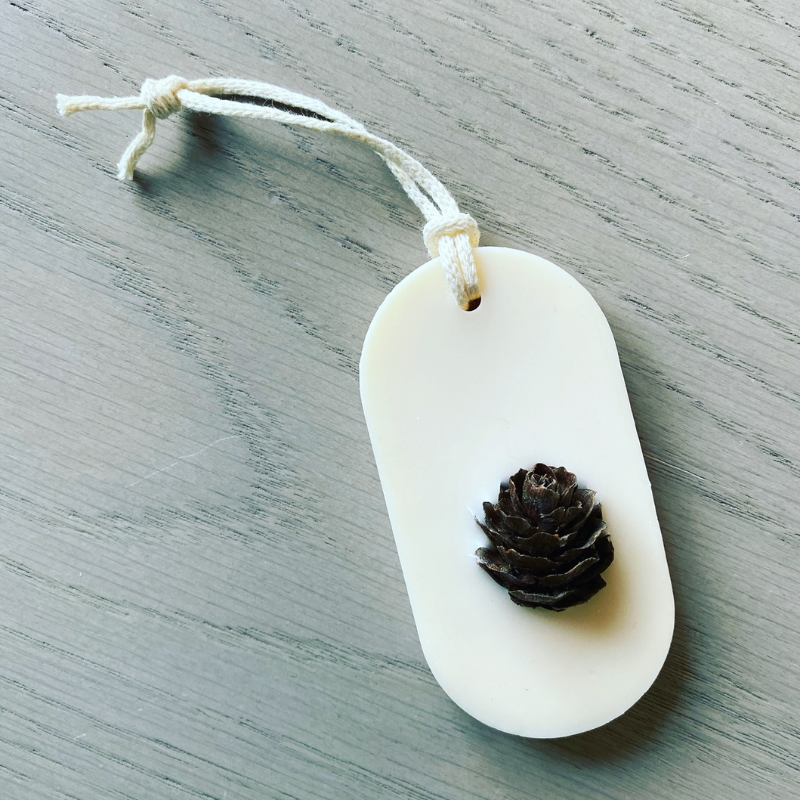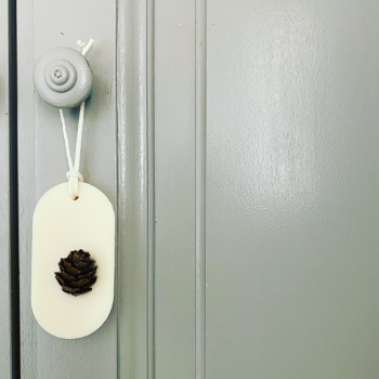 Une décoration naturelle faite d'une pomme de mélèze recueillis par la créatrice lors de ses randonnées dans les Alpes.